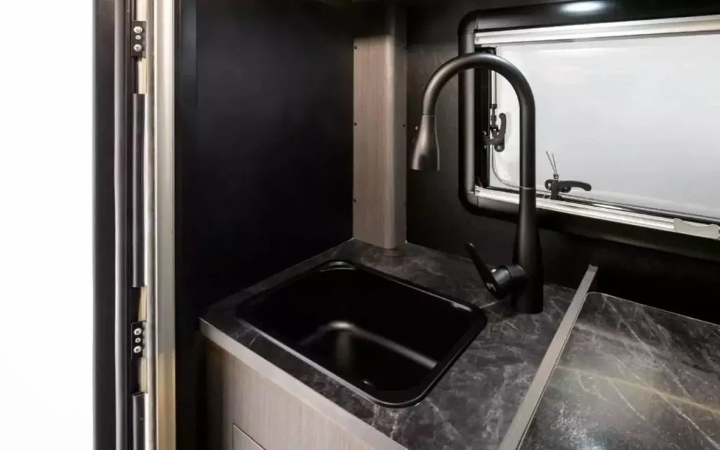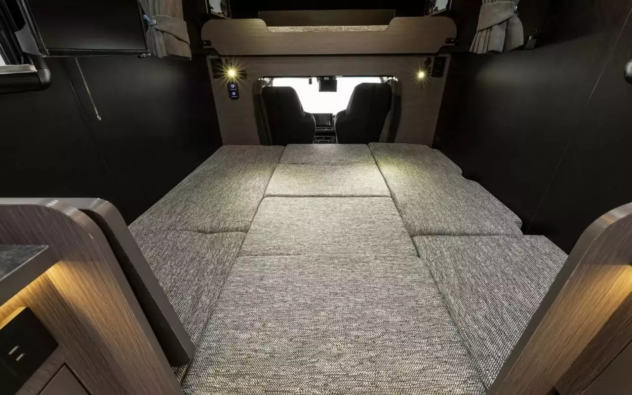 — Спальные места: двухспальная кровать, расположенная над кабиной водителя, и еще одно место, которое трансформируется из обеденной зоны. Теоретически в автодоме могут переночевать до четырех человек, хотя пространства будет в обрез.
